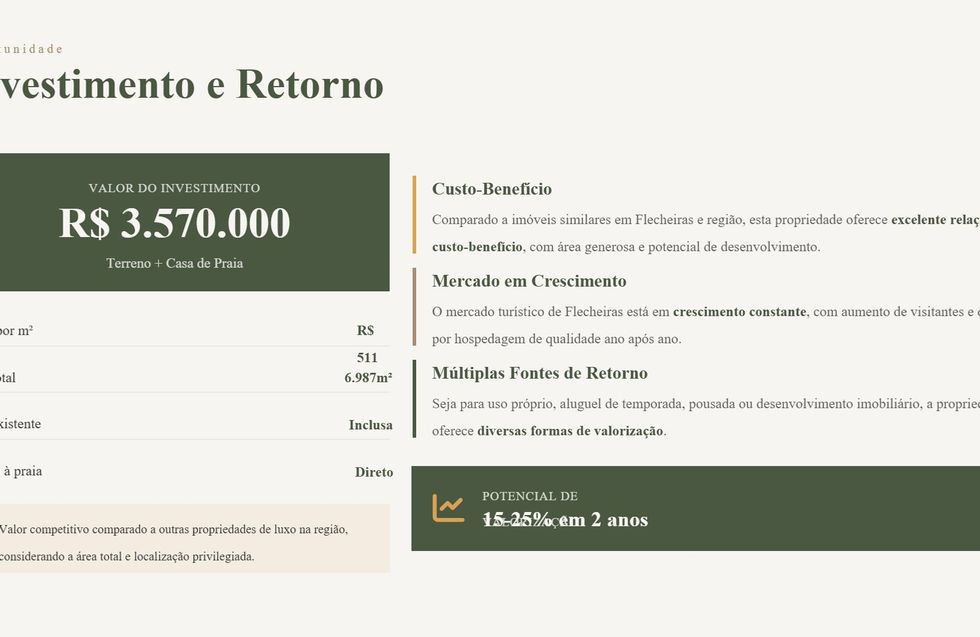 Análise de Mercado: A região apresenta uma projeção de valorização estimada entre 35-50% em médio prazo (3 a 5 anos), impulsionada pela infraestrutura crescente e o posicionamento na Rota das Emoções.